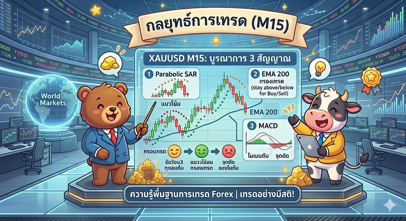 กลยุทธ์ P.SAR + EMA 200 + MACD บน TF M15